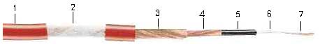 1・ジャケット PVC φ5.3mm 2・ビスコース繊維による信号線保護 3・シールド(#1) 0.10mm銅線 (芯線を100%カバーします) 4・シールド(#2) 0.10mm銅線 (芯線を100%カバーします) 5・保護層 導電性PVC 6・絶縁体 PE φ1.25mm 7・導体 0.20平方mm (OFC銅線 0.07mm x48本) 導体抵抗(信号線) < 90ohm/km (< 0.090ohm/m) 導体抵抗(シールド) < 28ohm/km (< 0.028ohm/m) 静電容量(信号線/シールド) < 146nF/km (< 146pF/m) 使用温度範囲 -5℃ ~ +50℃ 保管温度範囲 -30℃ ~ +70℃